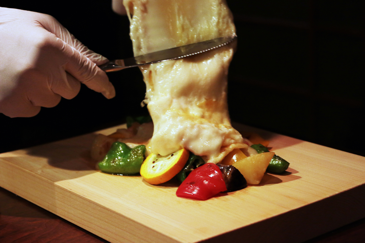 ▲とろ~りチーズがやみつきになるラクレット。熱々のチーズを目の前でのせてくれるパフォーマンスに心踊ります!鼻に抜けるようなすっきりとした味わいの辛口「カタシモ 利果園(りかえん)」と相性抜群◎