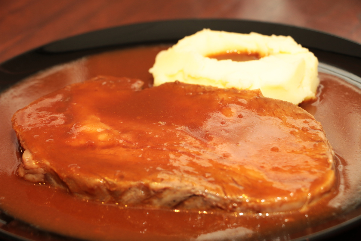 ▲お箸で切れるほど柔らかいアンガスビーフの煮込み。あっさりとした赤身にグレイビーソースをかけていただきます。飲みごたえのある「飛鳥メルロ」と召し上がれ。