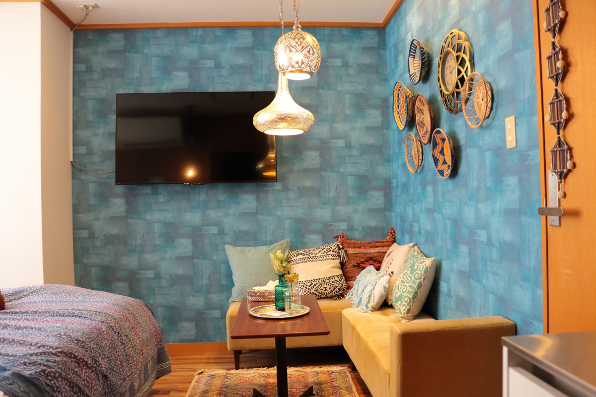 ▲デザイナーさんに依頼し、自由にやってもらったという内装デザイン。ボヘミアン調の雰囲気を演出しながら、コンセプトである水辺をイメージしたブルーを基調としている。