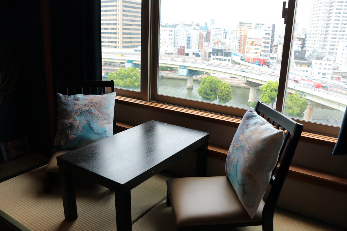 北浜駅から約200mという好立地にあるビルの8階にあり、1フロア1ゲスト48.9㎡とゆったり空間。青を基調とした室内は、掛け軸に滝の絵柄の帯を採用するなど、水都と和とボヘミアン調の雰囲気を融合させたエレガントな雰囲気になっています。畳の部屋の窓からは川が眺められ、窓際に設置したチェアに腰掛けて、好みのお酒を片手にのんびりと移り行く川のある風景を楽しむことができます。