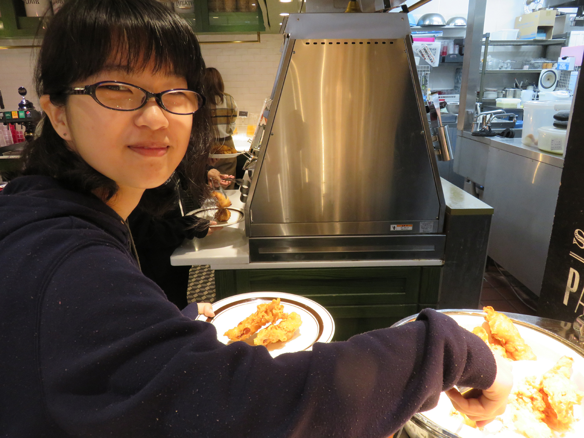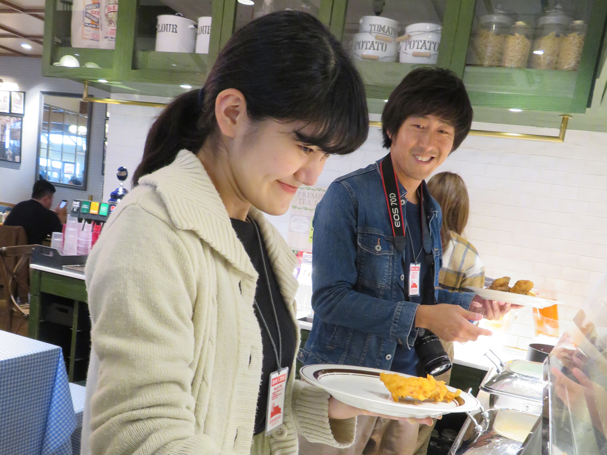 お皿を手にしていよいよスタート!待ちに待ったおいしそうなチキンを目の前についつい笑みがこぼれてしまう私たち。チキンだけでも部位ごとの種類が豊富で、チキンを選ぶだけでも悩んでしまいます。