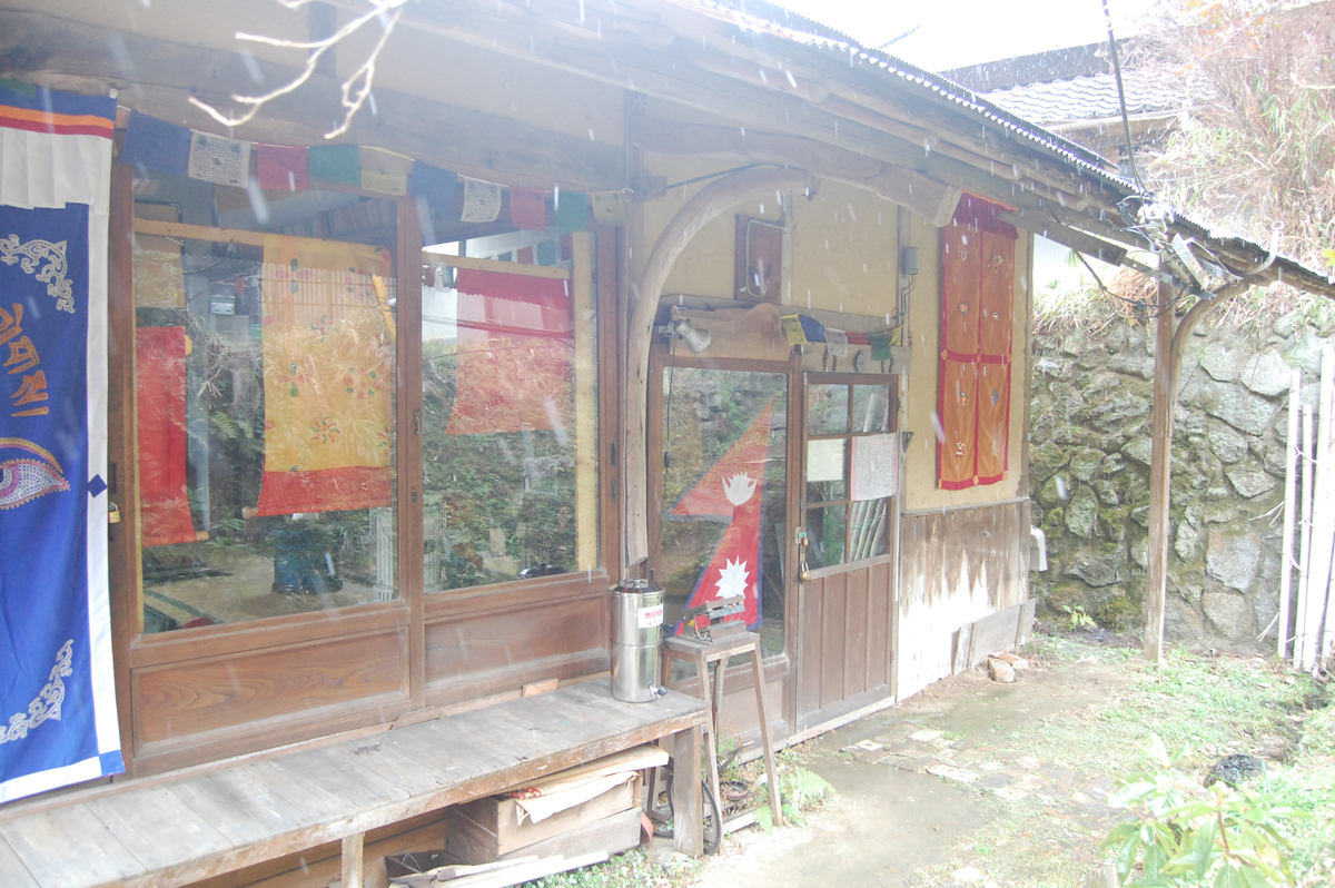 山奥に行くとさらに雪が激しくなってきました。都会のおっさんずは凍えています。そんなおっさんずにお構いなく、「この奥に山小屋があるのよ~」と民家の立ち並ぶ細い路地に入っていく山内さん。「えっ?ここ通っていいんですか?」というような人の家の庭先みたいなところを通りたどり着いたのは「Dolpo B.C.」というカフェのような山小屋のような古民家を改装したスペース。