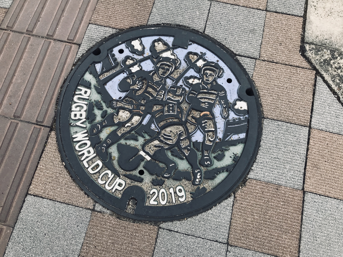 駅前からラグビー場にかけてはラグビーっぽい演出がされています。マンホールだったりガードレールだったりがラグビーデザインです。さらに、ラグビー関連のお店も色々とあります。ラグビーショップもあればラグビーコンセプトの和菓子を販売しているお店もあります。