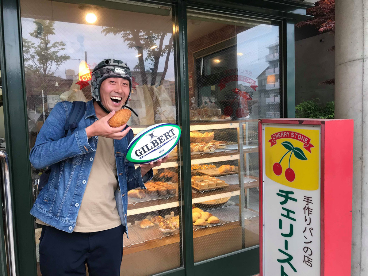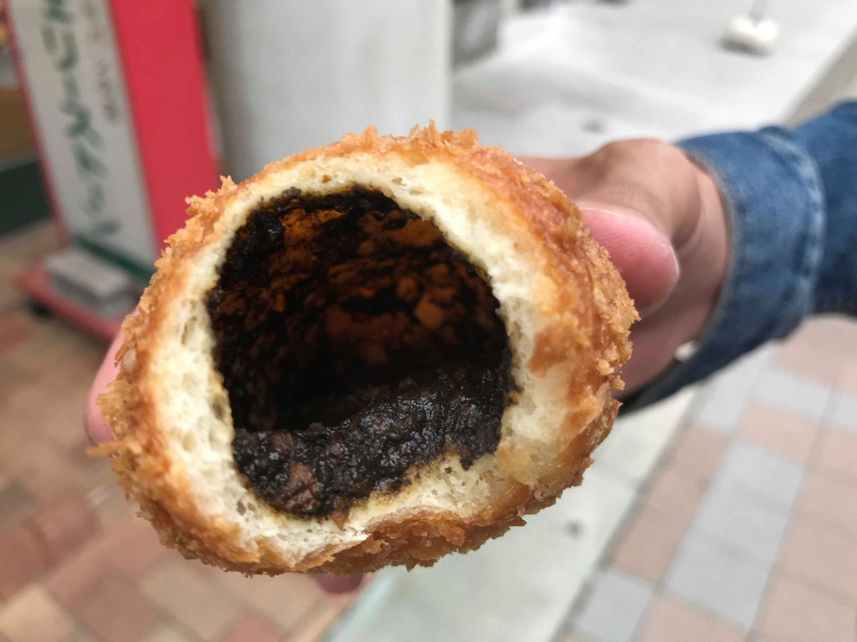 で、我々が食べたのがご当地グルメのために無理やり作った感のあるご当地グルメ「ラグビーボールカレーパン」。確かにラグビーボールの形をしてますね。えっ?味?おっさん2号しか食べてないので分かりません。写真の通り中は黒かったです。
