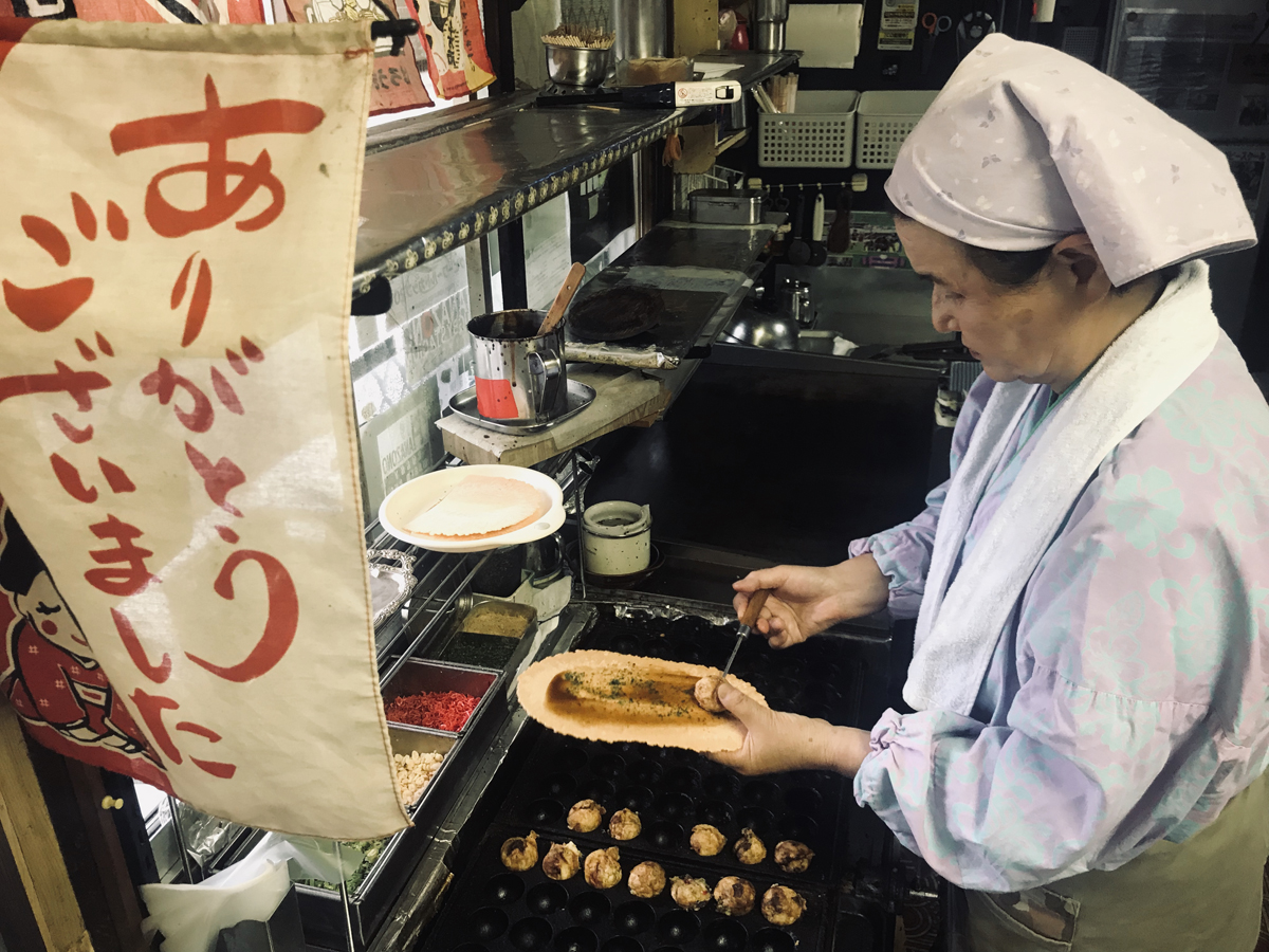 おっさん1号は駅につくなり「お腹すいた!お腹すいた!」と自己主張し、たこ焼き屋に直行します。おっさん2号この顔色!日本酒をどれほど飲んだのかよく分かりますね。ここではたこ焼き(塩)、焼きこんにゃく、タコ醤油焼きなどを美味しくいただきました。