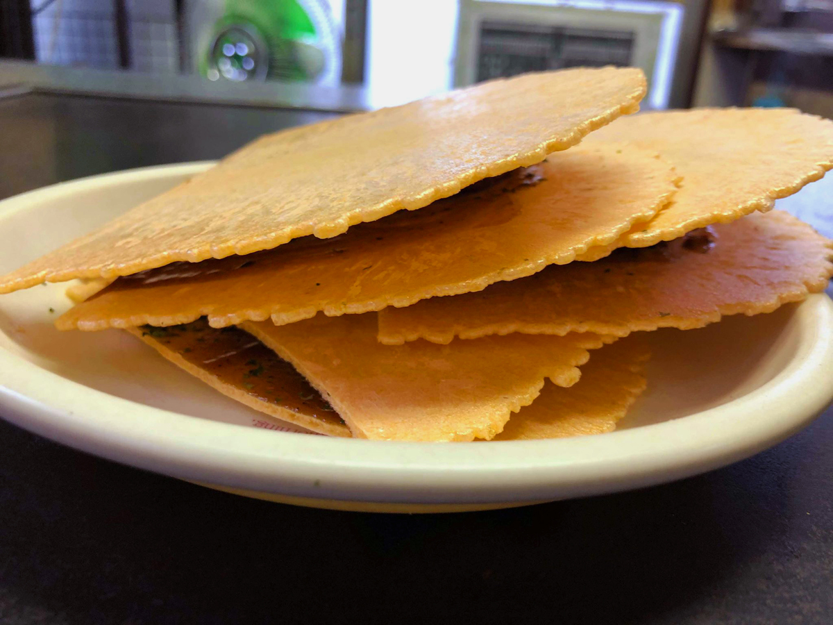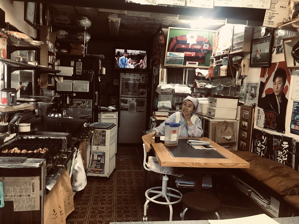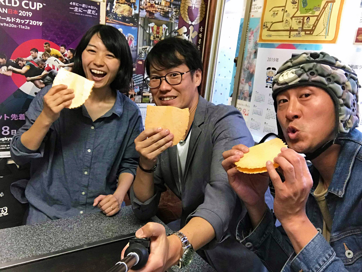 店内にはいると、壁から天井からラグビー選手のサインがびっしり。これは圧巻です。ここで名物?のたこぼん(50円)を食べます。たこ焼きをせんべいで挟んで、ブチュっと潰して出来上がり。懐かしい味を味わいながらお母さんとラグビートークで盛り上がります。