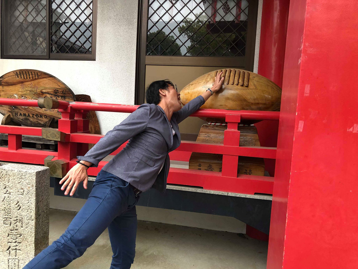 春美を出てラグビー酒場に向かいます。その前に近所にある吉田春日神社(通称ラグビー神社)にお参りです。ゴールポストのような鳥居を抜け、その奥のラグビーボールをトライすると願いが叶うということで挑戦します。なお、願い事はどこにいっても「商売繁盛」です。