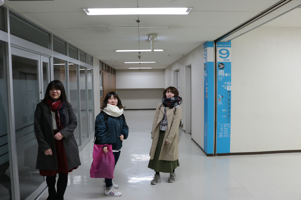 地下鉄本町駅から堺筋本町駅の一駅区間が4号館から9号館への廊下で結ばれていて、ビルの管理会社の方に「ぜひ歩いてみてください」と勧められた通り3階の廊下を歩いて後ろを振り返ってみると一番奥が見えないという状態!「一駅ってこんな距離なんや〜!」とみんなでおしゃべりしながら歩いていました。