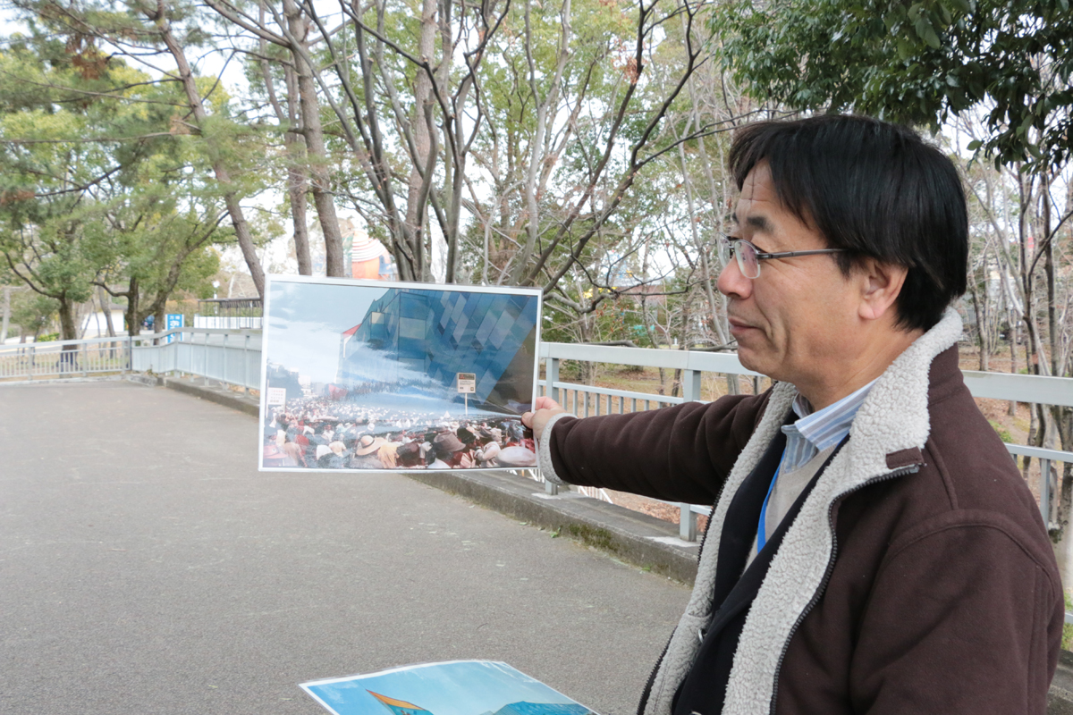 移動の際、橋(左写真)を渡りました。なんとこの橋の先に一番人気のパビリオン、三菱未来館があったそうで、白井さんの写真には当時のごった返す人々の様子が写されています。そこに並ぶ人があまりにも多く、急遽別経路の階段が作られたそうで、今も残るその階段に当時の行列の写真を重ねて見せてくださいました。
