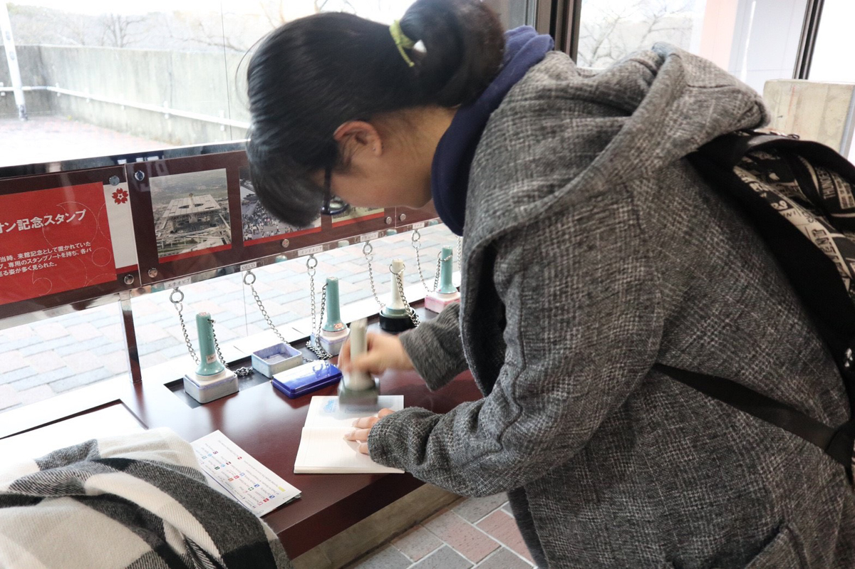 階段を上がってすぐのところに、当時来館記念として置かれていた記念スタンプが。このスタンプについても白井さんの解説が入ります。私たち学生は必死にスタンプを押しています(笑)当時の来館者たちもこうしてスタンプを集めていたのでしょうか?