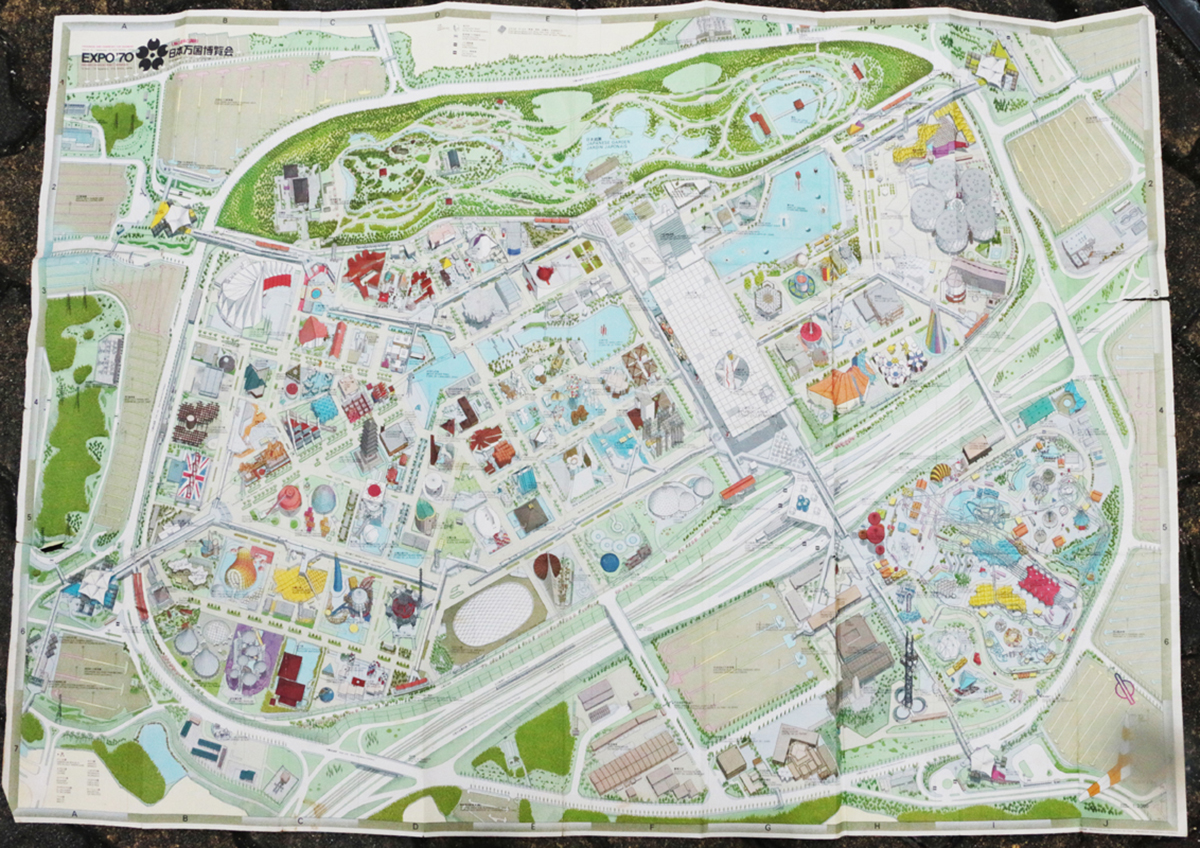 インタビューをはじめる前、万博記念公園内を案内していただきました。白井さんが用意してくださった現在のマップ(右写真)と、当時のマップ(左写真)を見比べながら辿っていくツアーとして、EXPO’70パビリオンなどもまわっていきます。