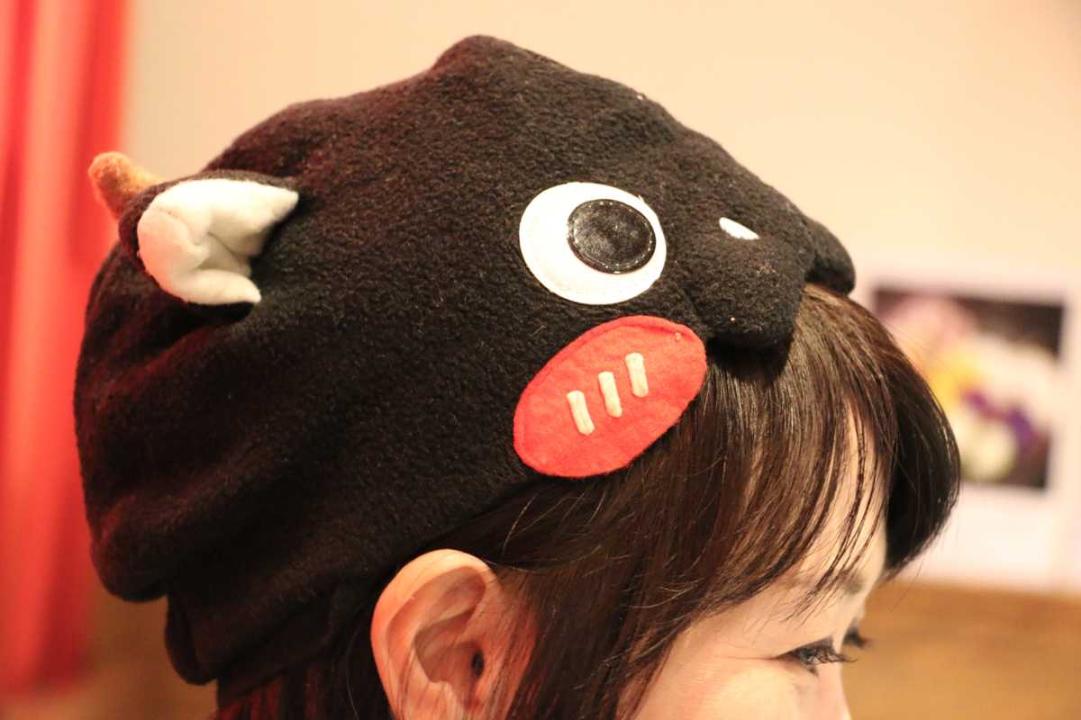 ▲I ❤ NIKUのTシャツや牛の帽子を被って焼肉のPRをするいかりんさん。