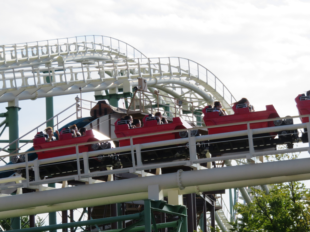 ▲ジェットコースターはどんどん加速していき、何度も急降下を繰り返します。怒涛の恐怖に、乗客の叫び声が終始響き渡ります…。ちなみに一番後ろの右座席がこのコースターの中で最も怖い座席なのだとか。