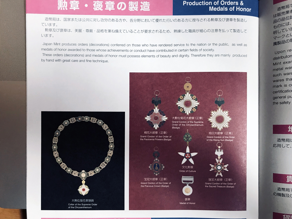 ↑せっかくなので、造幣局のパンフレットに掲載されている写真でご紹介。「大勲位菊花章頸飾」は左下の黒背景の写真です。