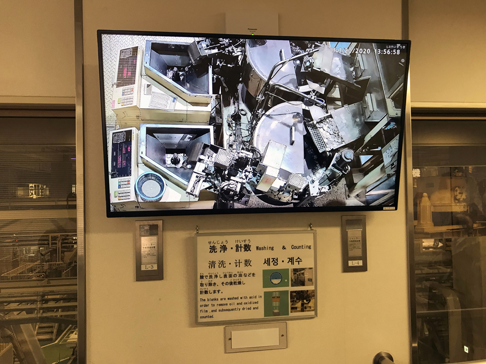 ↑プレスが完了したら、模様がきちんと打刻されているかどうか、自動でガンガン検査されます。一部目視での確認を行う人もいらっしゃいました。
