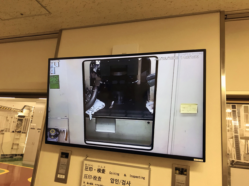 さすがにつくられているのがお金とあって、工場作業場内への入場は金属探知機の通過などセキュリティがとても厳しく、通常は造幣局職員でも滅多に入れないとのこと。ただし観覧廊下には随所にモニターが設置してあって、各製造過程の様子が見られるようになっていました。