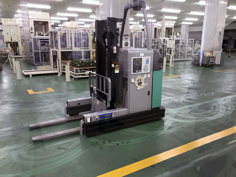 現在、コロナの影響で工場見学は休止中とのことですが、一般向けの再開のために準備を進めておられます。1階から工場に入り、まず案内してもらった2階の観覧廊下には、ソーシャルディスタンスを保って見学ができるように、足元に待機場所マークが貼られていたりしました。