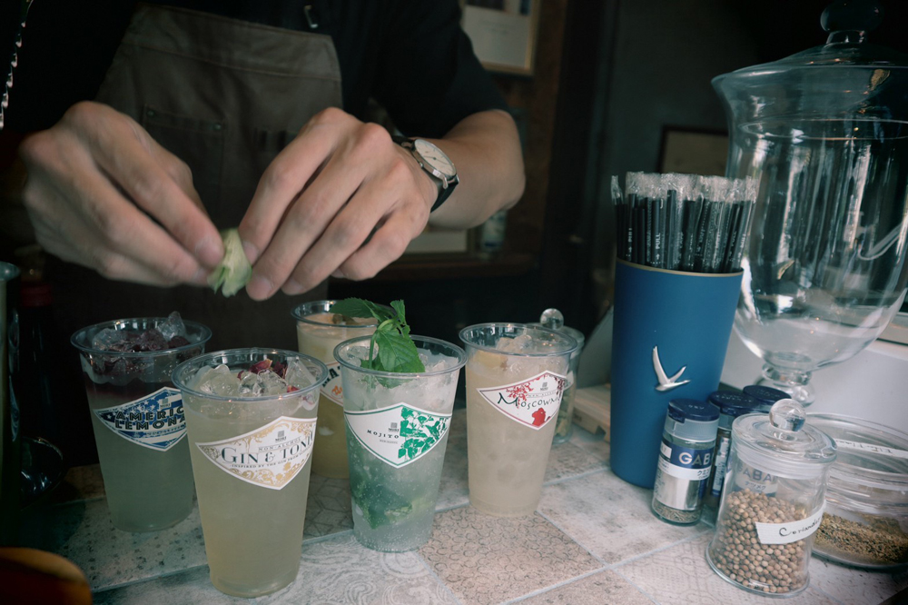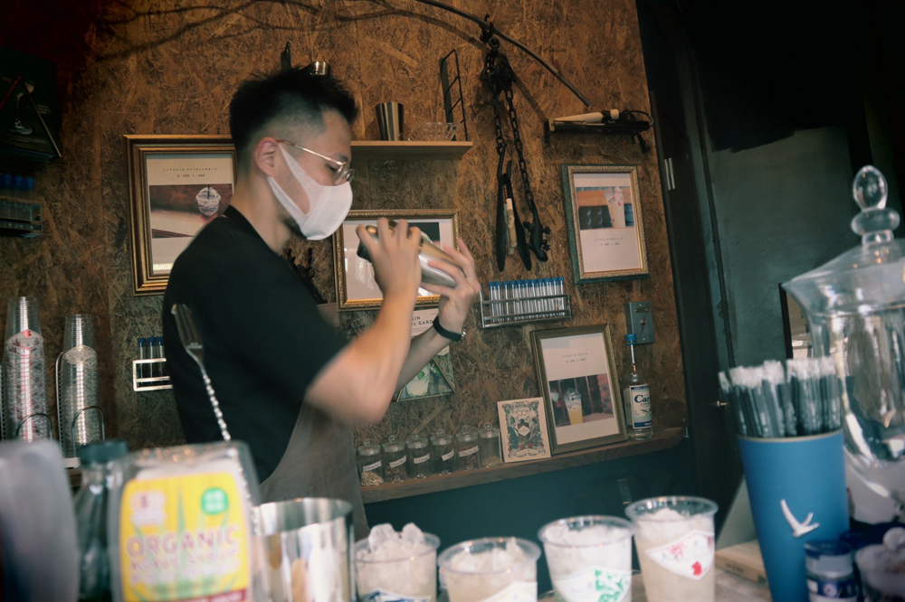 北浜の方でもバーを経営しているという、店主の桐山さんによると「北浜の方でモクテルをちょくちょく出していて、それを店としてやってみたらどうなるかなって。日本ではまだ新しい“モクテル”という文化を広めていけたらいいなと思って。」ということだそうです。ここ本町で、昼間にモクテルバーを営業している桐山さん。夜にはもう一つの北浜のバーでお酒を作っています。新メニューは常に考案中とのこと...ずっとバーのことを考えているとは、さすがです!