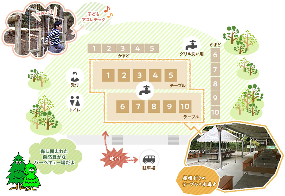 周りを森に囲まれた自然豊かで広々と落ち着いた空間です。駐車場からも近く、荷物の移動も楽ちん!家族づれ、友だちとも気軽に使えるバーベキュー場になっています。今回の企画のように食材持参でも楽しめますが、BBQやカレーなど事前に予約しておけば材料を用意しておいてくれるサービスや調理器具の貸し出しなど(共に有料)もあるので、手ぶらで来ることもできます!