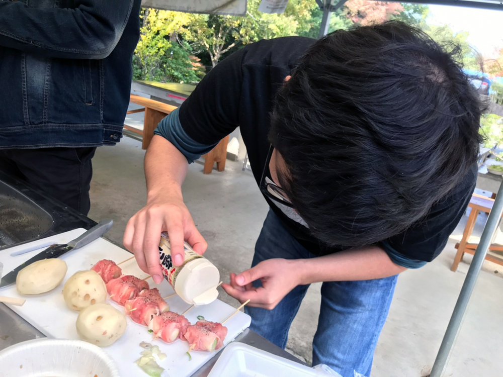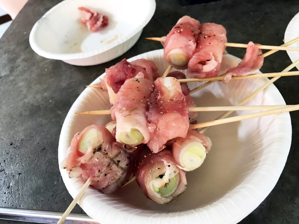 2品目「串焼きねぎ肉巻き」の味付けはシンプルに塩こしょうで。肉の味をそのまま生かし、誰もが好む定番の味を狙って仕上げていきます。