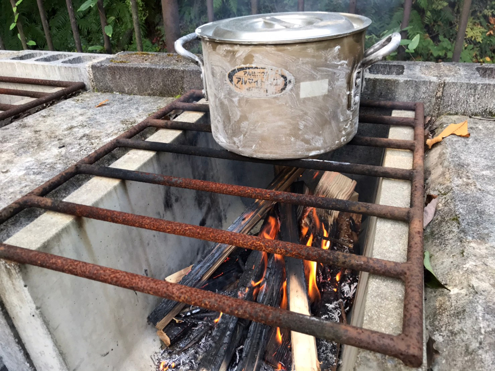 洗ったお米を鍋に入れて、薪に火をくべます。火力が強すぎると焦げてしまうので、調整が難しく、緊張感のある作業です。