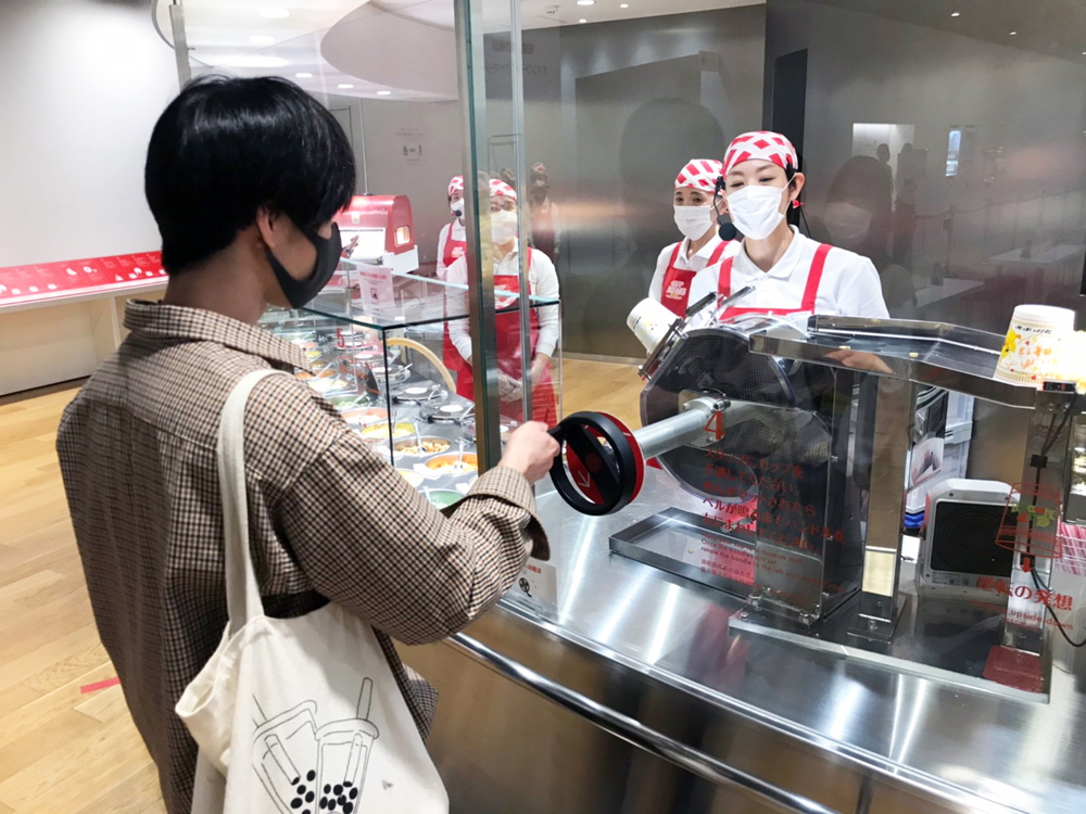 カップのデザインが終わったら、並んで従業員の方に託し、カップに麺をセットするところから教えてもらいます。実際に工場でセットされるのと同じ流れを、自分でハンドルを回して見ることができます!