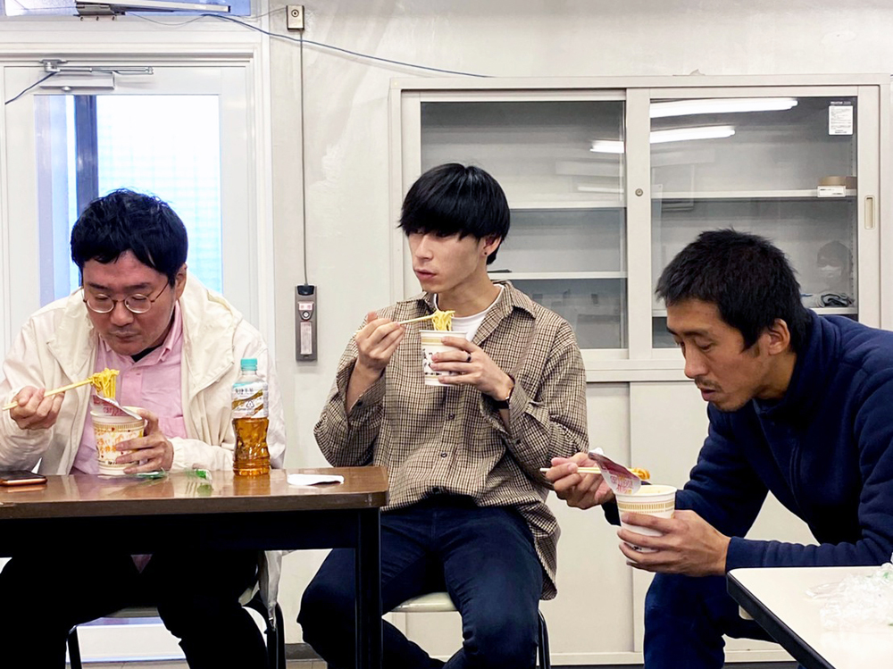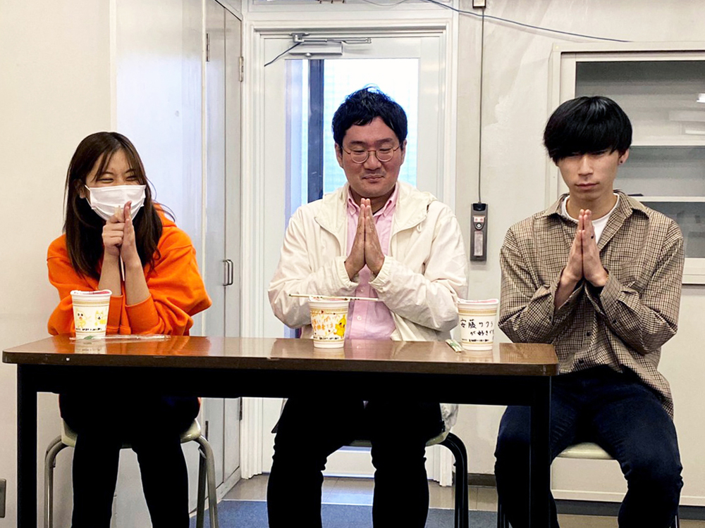 では、ここで私たちチーム「ジェネレーションギャップ」のメンバーと、取材に同行してもらった梅岡先生の4人による、本気のオリジナルカップヌードル食レポをお届けいたします!